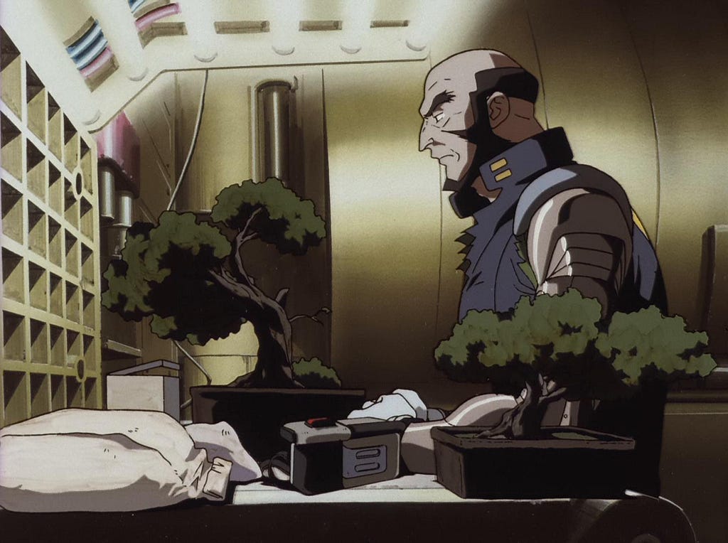 Mas não é só o Spike que vive de passado. Jet Black, o “pai” da tripulação, cuida de bonsais obsessivamente. Aquelas árvores pequenas e controladas são a única coisa que ele consegue dominar, já que não conseguiu controlar a traição que sofreu na polícia e a perda do seu braço. A calma dele ao podar os galhos é apenas uma máscara para um homem que perdeu o controle da própria vida e tenta desesperadamente manter a ordem dentro da nave.