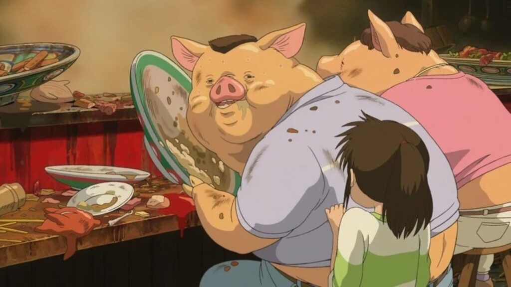 Tudo começa com uma cena que deveria ser um alerta para todos nós. Os pais de Chihiro encontram um banquete abandonado e começam a comer freneticamente, acreditando que “têm dinheiro para pagar depois”.